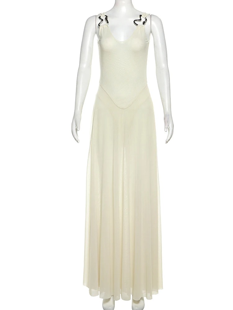 Nibber Holiday Women Dress Mesh Double V-Neck Skinny Metal Buckle Summer Trend Banquet Birthday Elegant Wedding Maxi Bodycon
