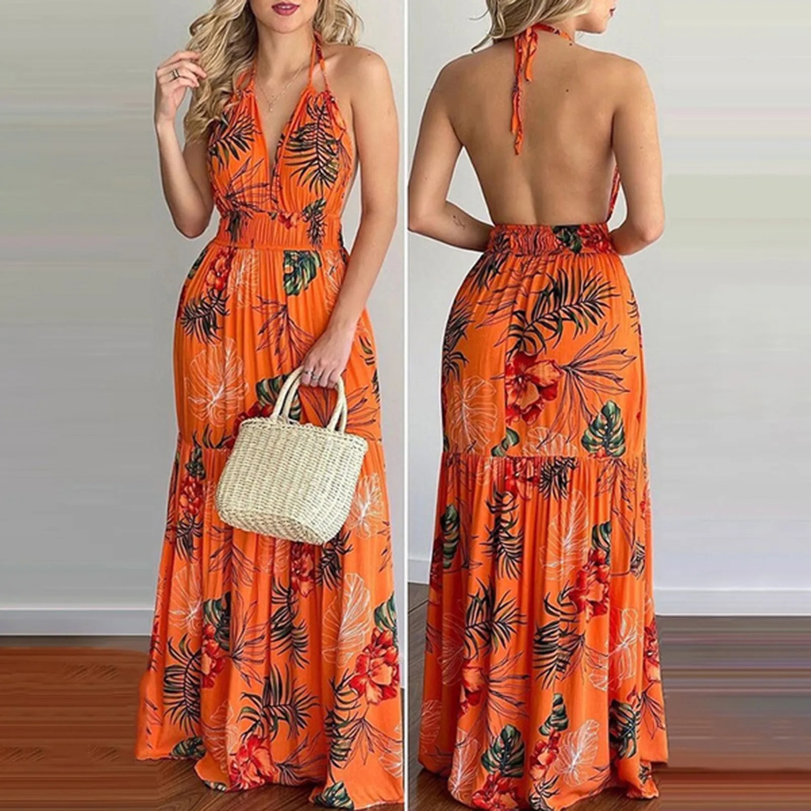 • Sexy Boho Beach Dress Women Casual Tropical Floral Print Robe Halter Backless Maxi Dresses Summer Sleeveless Sundress платье